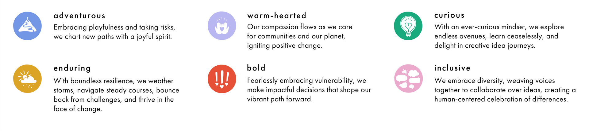 We live by our six Cultural Values – adventurous, curious, enduring, bold, warm-hearted, and inclusive.